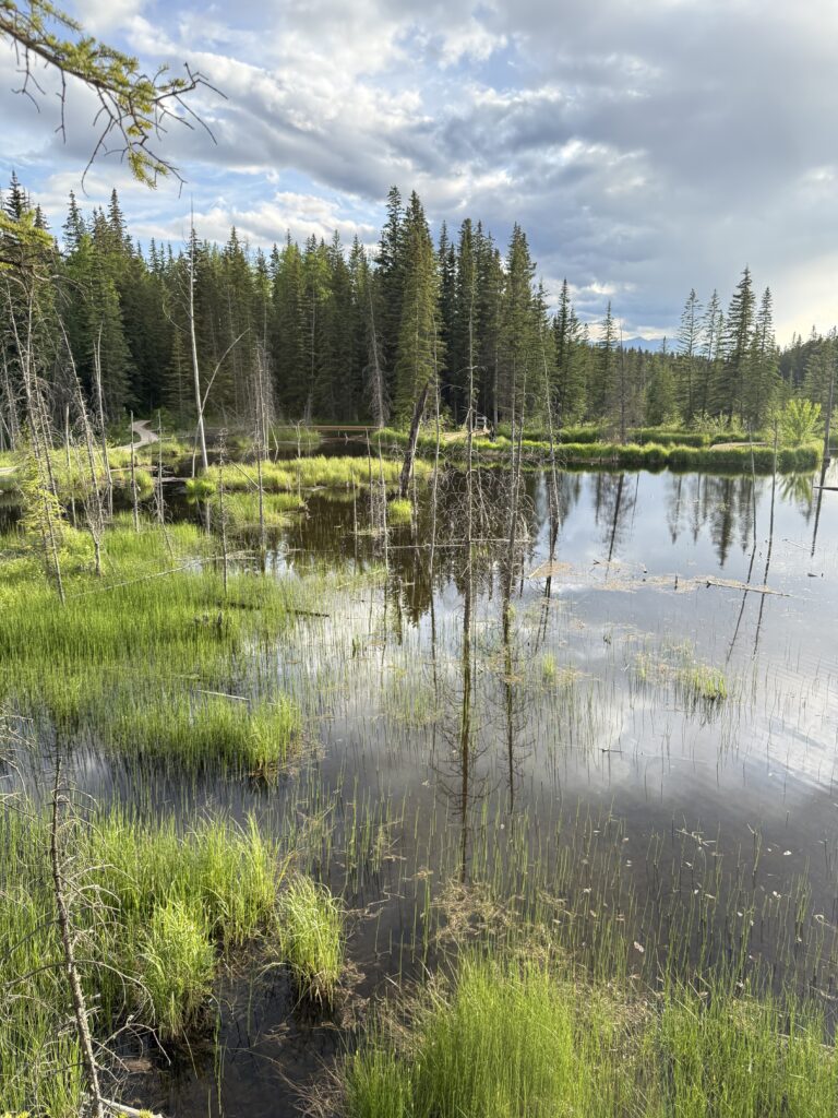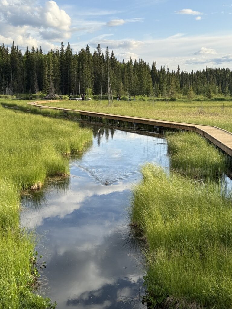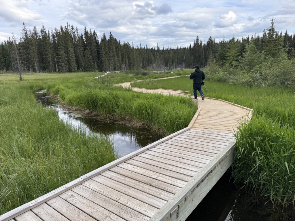 The Beaver Boardwalk in Hinton is a peaceful, family-friendly trail that winds through wetlands and alongside the river, offering a front-row seat to Alberta’s wildlife. It’s especially popular for spotting beavers and muskrats in their natural habitat – keep an eye on the water for busy beavers building lodges or gliding through the river, and watch for muskrats darting along the banks. The boardwalk itself makes wildlife viewing easy and safe, while the surrounding scenery of marshes, forests, and open water provides excellent photo opportunities and a relaxing escape into nature.